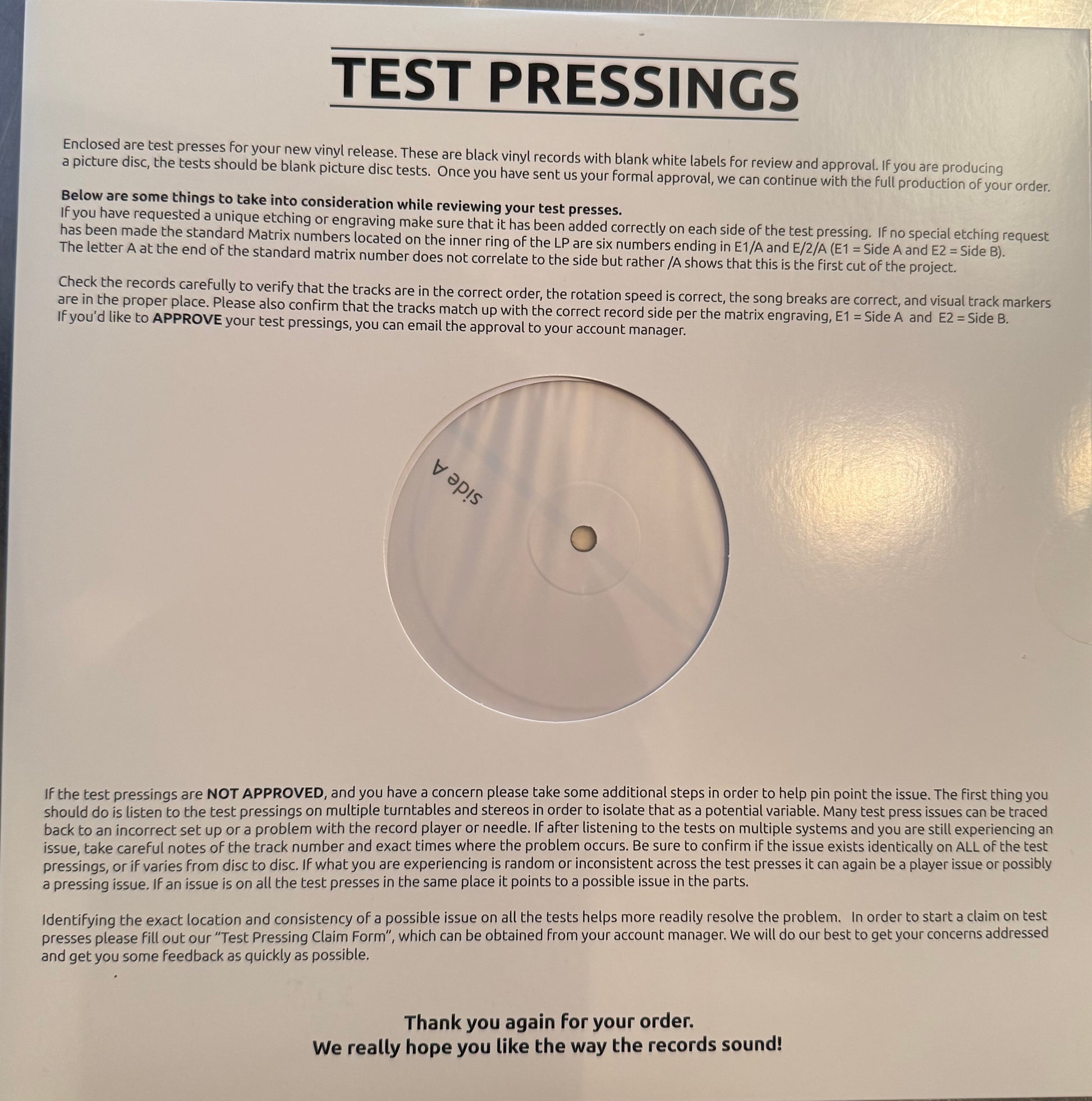This rare test pressing was produced by the pressing plant to ensure sound quality and manufacturing accuracy prior to full commercial release. As is standard with test pressings, it is housed in a generic white sleeve and does not include finished album artwork or a branded center label. Test pressings are manufactured in extremely limited quantities, making them highly sought-after by collectors. These pieces offer a unique behind-the-scenes look at the vinyl production process and represent a true collectible from music history.